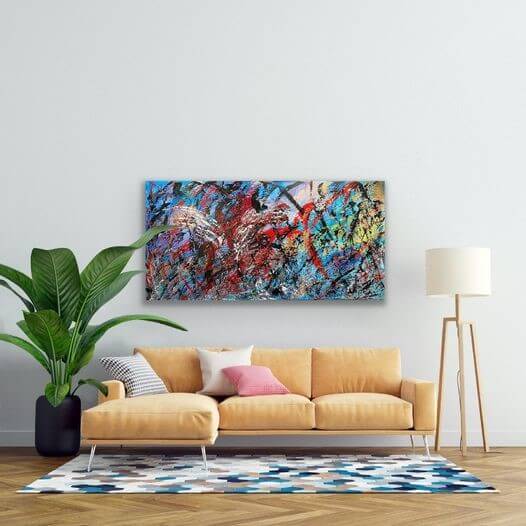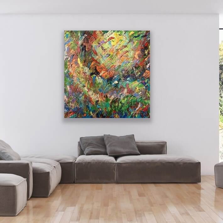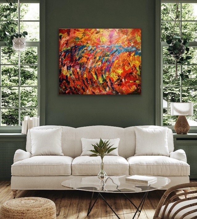 Big Bang - The Big Bang started it all. An explosion of epic proportions and colors. Rich, deep texture tells stories from time’s very beginnings. It turns your wall into a panoramic vision of light and sound and explosive passion. Created to some of the most soulful and inspirational music ever recorded. Feel the heat. Experience Big Bang. - Big Bang 48” x 60”