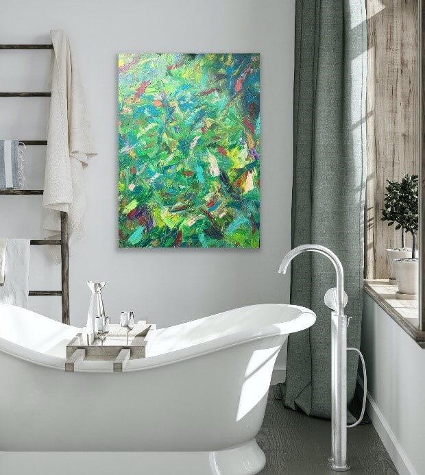 Vitamin Sea - Under an abstract sea, life is a blend of soothing color, swishing strokes through imaginary sea life and depth and texture that appears through imaginary glass. It’s an aquarium of the mind’s eye. It’s a journey though the bottom of your mind’s sea. It’s life giving. It goes on forever. Stare into it. It calms yet invigorates. You can’t take your eyes off it. Is it moving? So much color, it seems unreal. Maybe it is. That’s’ the abstract sea. That’s the tonic. That’s the Vitamin Sea. Painted to the soundtrack from my favorite surfing film, Big Wednesday. - Vitamin Sea 48” x 60”