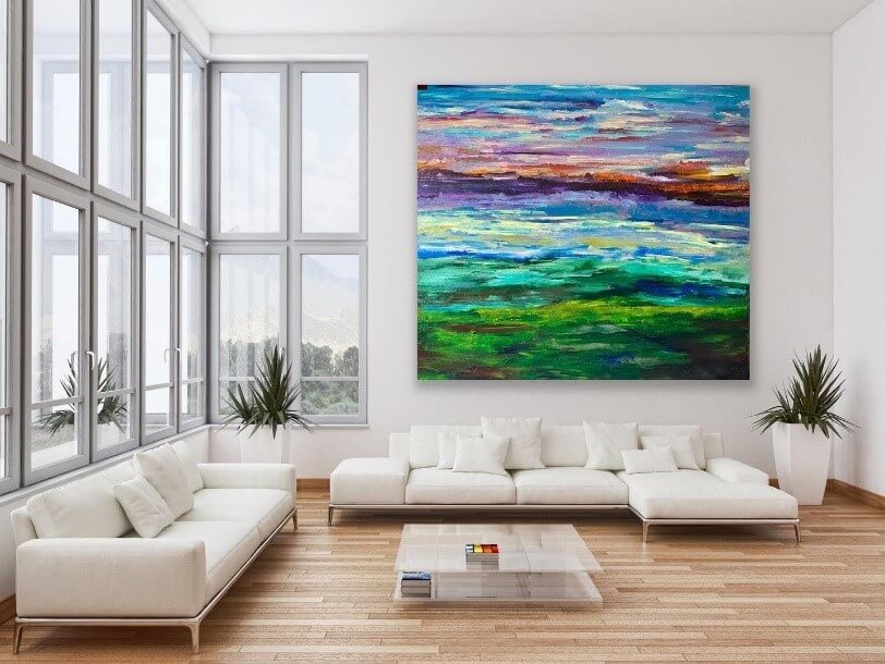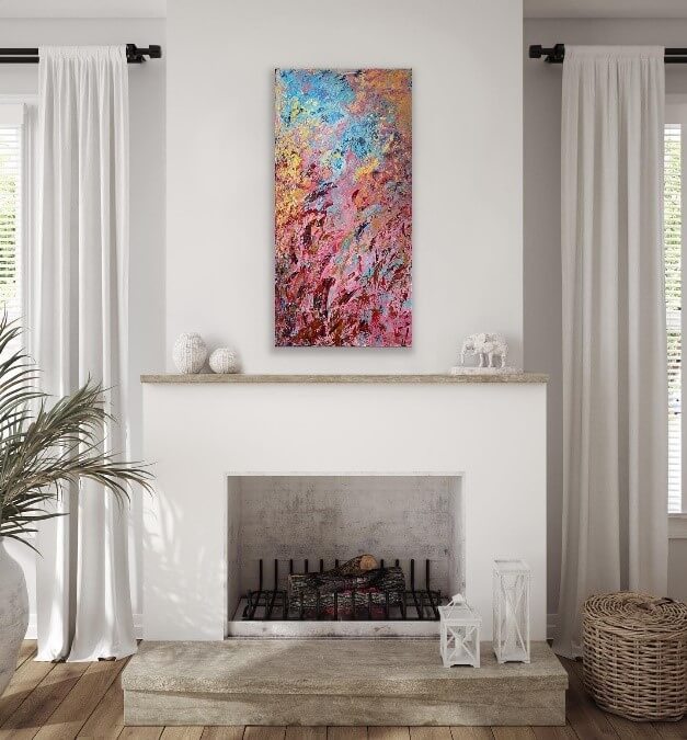 The Majestic - Stand on mountaintops, on drastic peaks. On the precipice of tomorrow. In the moments, stare into The Majestic. Encounter awe. Drink life. Blend the colors of yourself and dream. It’s a window on your memories. It’s a trip to the possible. Painted to the groovy, iconic sounds of the 70’s in the Laurel Canyon. Jackson Browne’s debut album. Mama Cass. Joni Mitchell’s Blue. Bonnie Raitt’s first. Buffalo Springfield. - The Majestic 20” x 72”