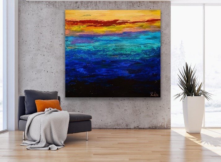 Tahiti - The vibrant color of tropical daydreams. Sun healing worried souls. Tepid sand leaving the past behind. Boat drinks and music played on simple metal pans. Hide away. Write the novel. Lead the mutiny of your own. On your wall, it calls to you. It reflects your everyday and makes it sing. Painted to a collection of the sounds of Sting. Romantic. Introspective. Nothing Like the Sun. - Tahiti 36” x 48”