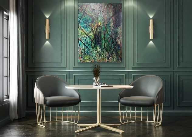Eroica - The meaning of the word, Eroica is heroic. Beethoven called his third symphony The Eroica. It was dedicated to Napoleon, who at the time was viewed as heroic and the great liberator of the French Revolution. As a work of art, Eroica exhibits bold strokes of emotion against a muted background to capture all the available light, creating a truly heroic expression. It blends with fabric and earth tones, and leather pieces in a way most work does not. It ignites. It’s a revolution all to itself. Painted to Beethoven’s Third Symphony, recorded by the Berliner Philharmoniker conducted by Herbert Von Karajan. - Eroica 40” x 60”