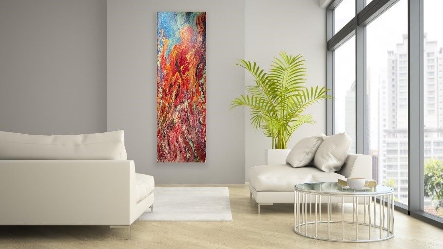 Icarus - Take a trip to the sun, but don’t get too close. But that’s where the fun is. Passion, color, and bold slashes of the palette knife take you as close as you need to be. Feel the warmth, the excitement, the depth and spread your decorating wings. Created to the sounds of Yes, a visionary group of skilled musicians taking their own trips near the sun. Bold. Movement. Passion. Depth. Exhilaration. Heat. Color. - Icarus 30” x 60”
